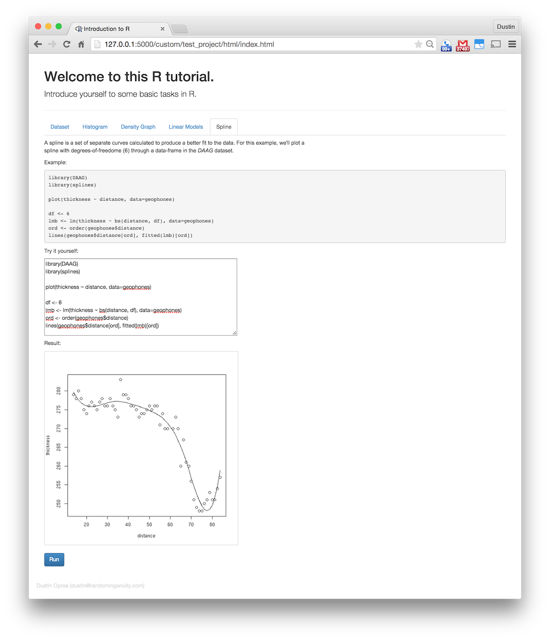 So, assuming that you just want to run your own server, I’ve created a test-project to help you out. Make sure to install the requirements before running it. The project depends on the DAAG package. This is a companion package to a book that we use for the dataset in a spline example.