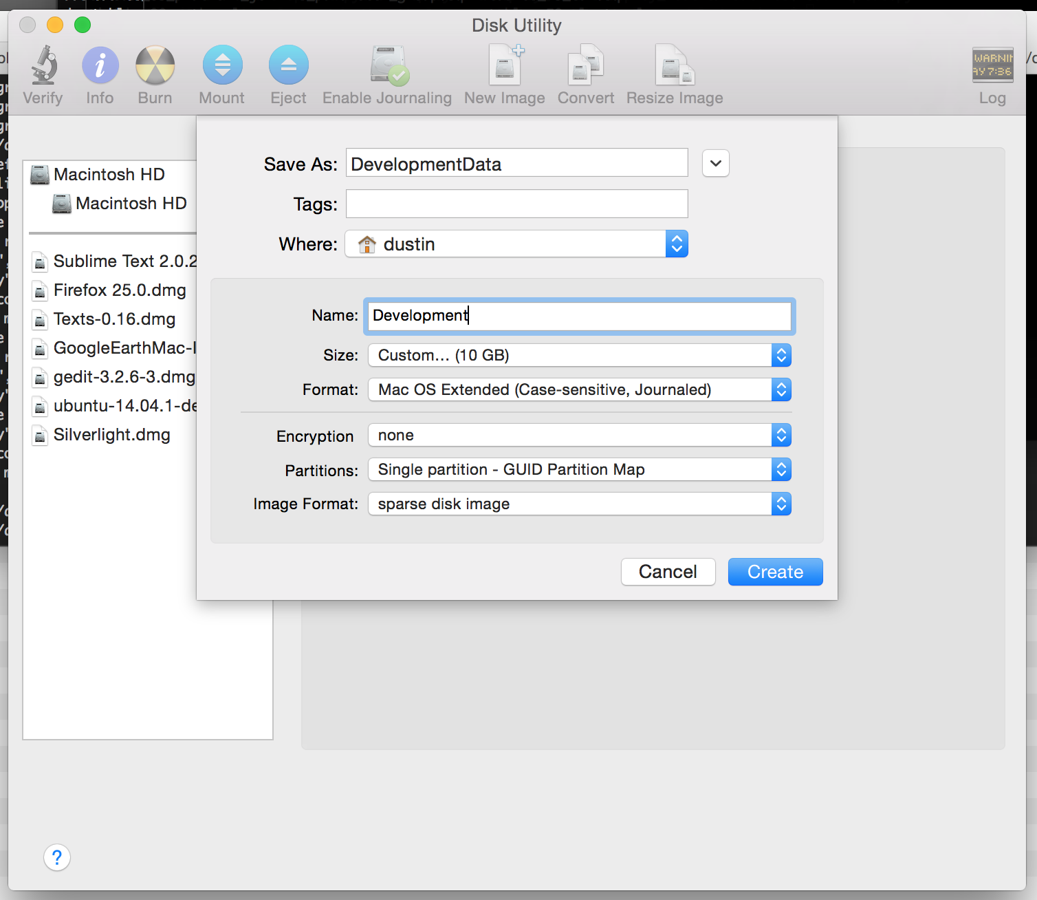Notice that I chose “sparse disk image” for “Image Format”. This starts with a minimally-sized container that’ll grow as I populate it with data, rather than starting off at the requested size.